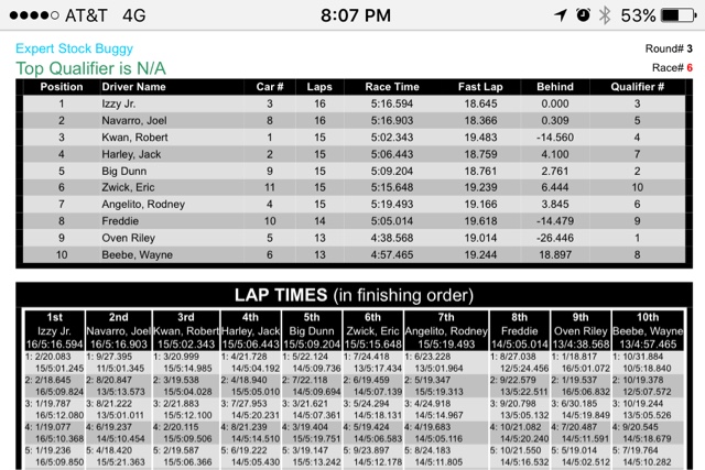 By the end of the B main my tires were coming in nicely! I charged a fresh pack for the A. Starting last, I took off slow on the tone and looked for crashes to take advantage of. I was able to move up to mid pack in the first few minutes of the race. Had a good battle going for 5th during the middle of the race with clean racing :). A crash on the last lap allowed me to move up to 4th :). My fast lap is also down to 19.3!